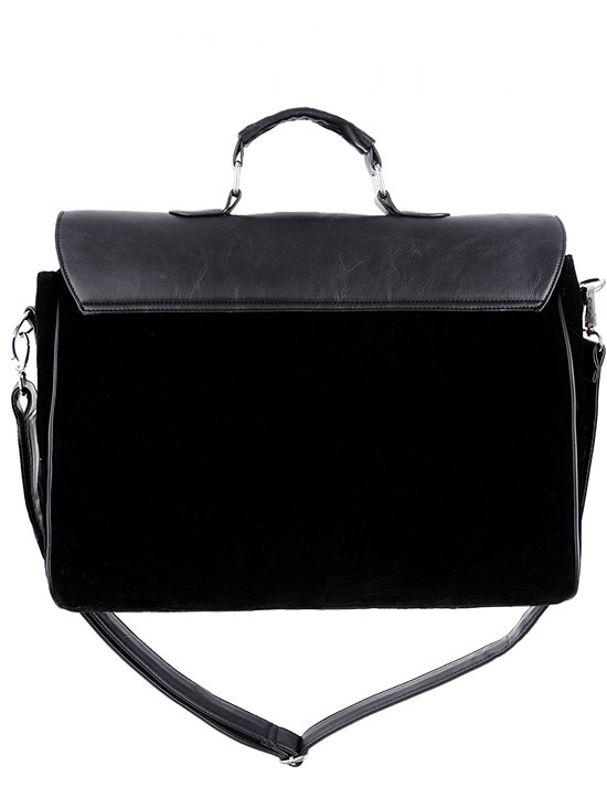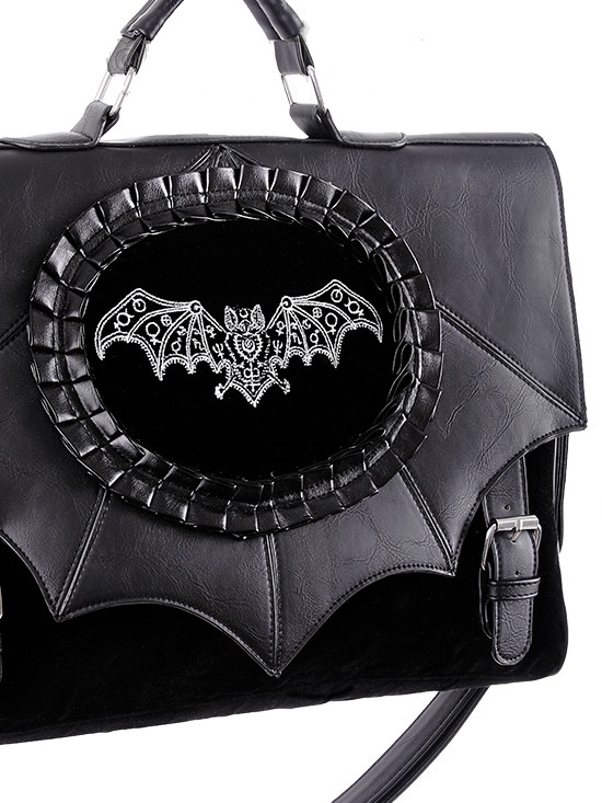 Taška z pevné, vyztužené umělé kůže v kombinaci se sametem a výšivkou netopýra.